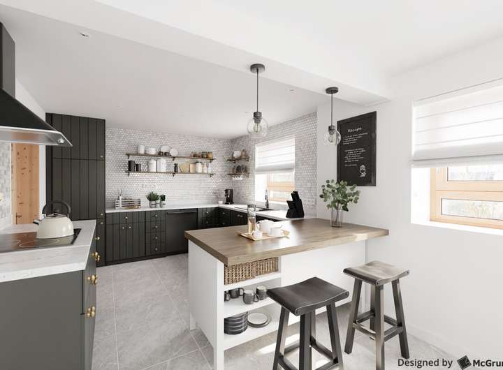Man betritt dieses über die Diele im Hochparterre. Hier befinden sich auf der rechten Seite der helle Wohn-/Essbereich mit ca. 40 m² sowie die Küche. Linkerhand folgen noch zwei weitere Zimmer sowie ein modernes Duschbad. Hier könnte man sich ein Gäste- und ein Arbeitszimmer gut vorstellen.