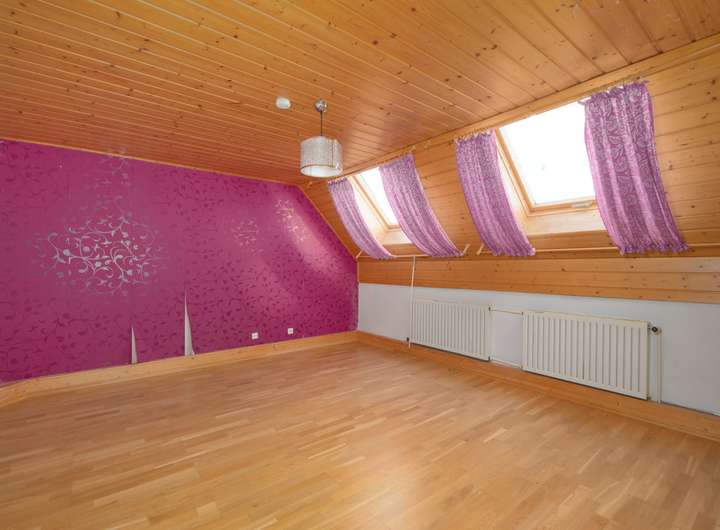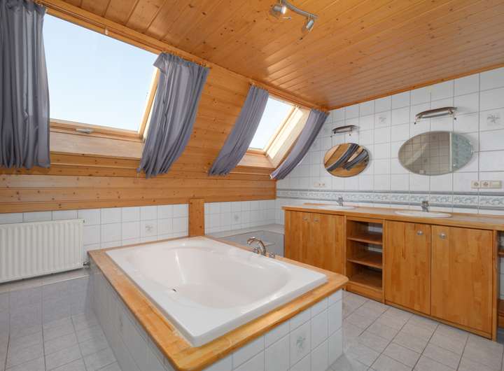 Im Dachgeschoss, das tatsächlich nur wenig Schräge aufweist, sind ein Schlafzimmer mit Ankleide und zwei gut geschnittene (Kinder-)Zimmer vorhanden. Ein Highlight ist das große Bad mit der freistehenden Badwanne.
