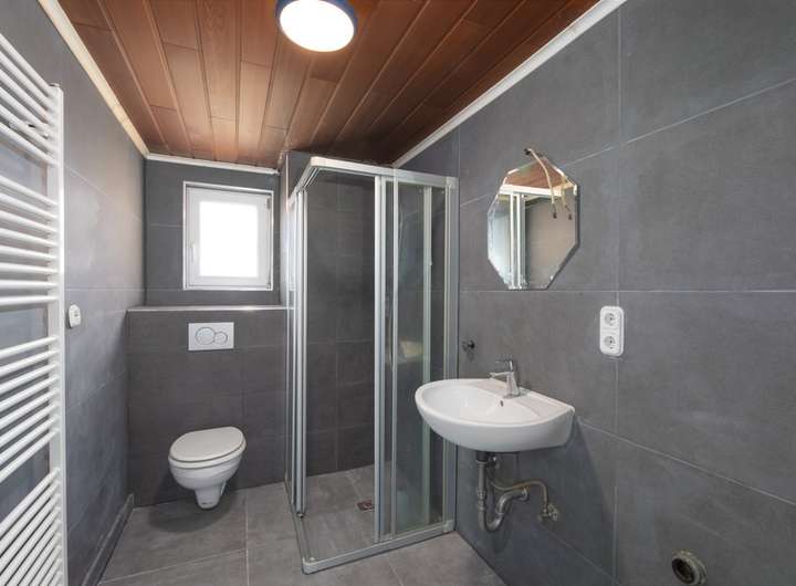 -EG: Modernisiertes Tageslicht-Duschbad mit ebenerdiger Dusche, wandhängender Toilette, Waschtisch, Handtuchheizkörper. Deckenhoch grau gefliest
