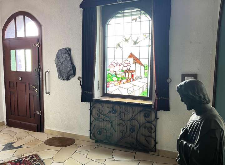 + teilweise ISO-Fenster in den Original Eichenholzrahmen u. Alu-Rahmen (ca. 1986) u. Buntfenster in Holzrahmen,