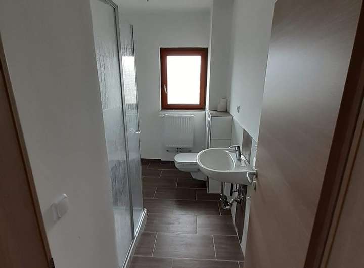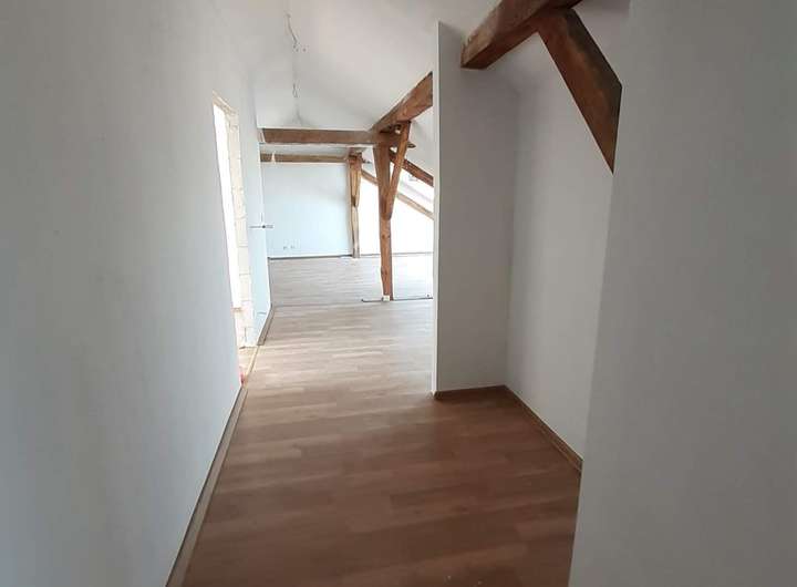 Die Wohnung im Obergeschoss ist eine 3 Zimmer Wohnung mit Küche und Badezimmer, verteilt über ca. 100m² Wohn-/Nutzfläche.