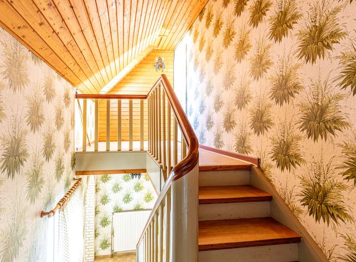 Im Erdgeschoss des Haupthauses befindet sich eine Dreizimmerwohnung mit Küche und Badezimmer sowie 3 individuell nutzbare Zimmer. Der gleiche Grundriss, nur mit Dachschrägen, befindet sich ebenfalls im Dachgeschoss. Auf einer Zwischenetage befindet sich ein weiteres Zimmer, das sich gut als Büro oder Schlafzimmer eignet.