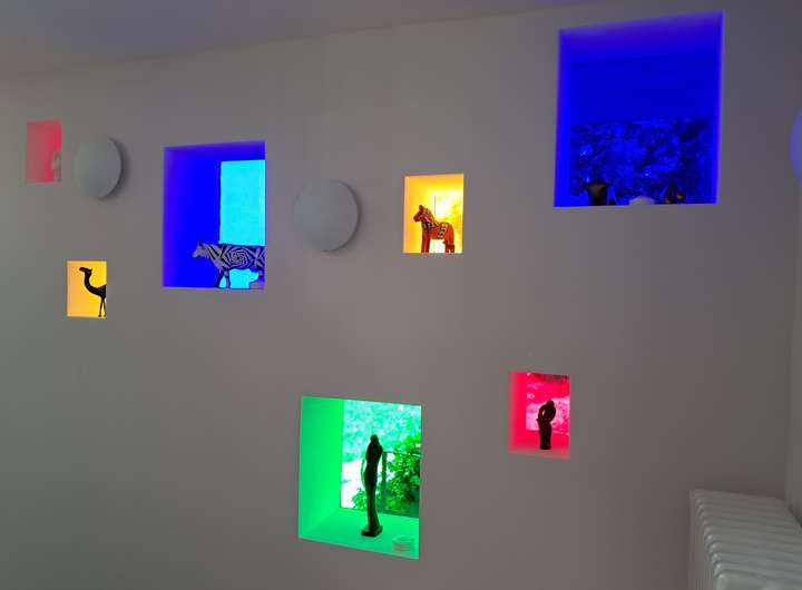 oranges Stahlgeländer, grüne Schieferflächen im Außenbereich bunte Glasscheiben (rot, gelb, blau).