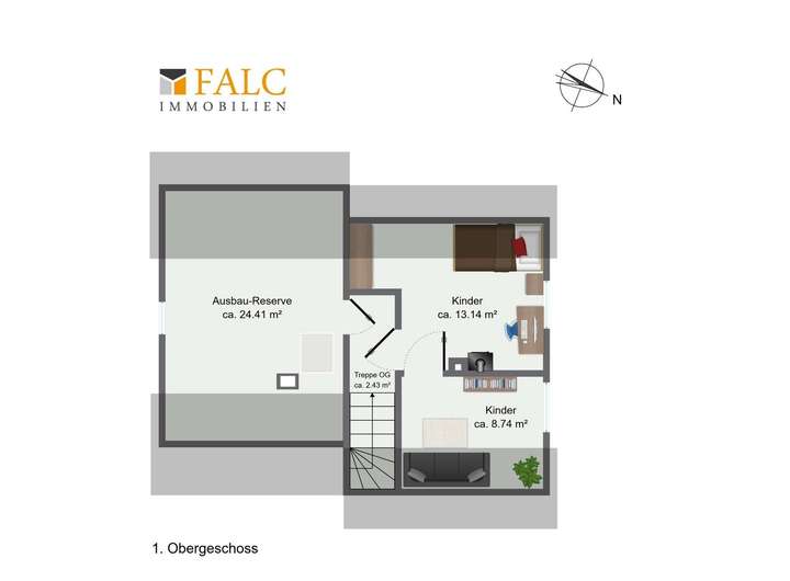 Über eine Treppe gelangen Sie in das Obergeschoss, wo sich zwei weitere Zimmer befinden. Diese eignen sich hervorragend als Kinderzimmer oder Büro. Ein besonderes Highlight ist die Ausbaureserve im Dachgeschoss, die Ihnen die Möglichkeit bietet, zusätzlichen Wohnraum zu schaffen.