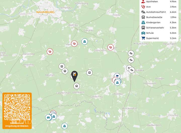 Der Anschluss an die Autobahn A9 ist in wenigen Minuten erreichbar, was eine schnelle Verbindung nach Halle/Leipzig oder Jena ermöglicht. Auch für Berufspendler ins nahegelegene Gewerbegebiet Osterfeld bietet sich mit dieser Immobilie eine gute Möglichkeit einen kurzen Arbeitsweg zu realisieren.