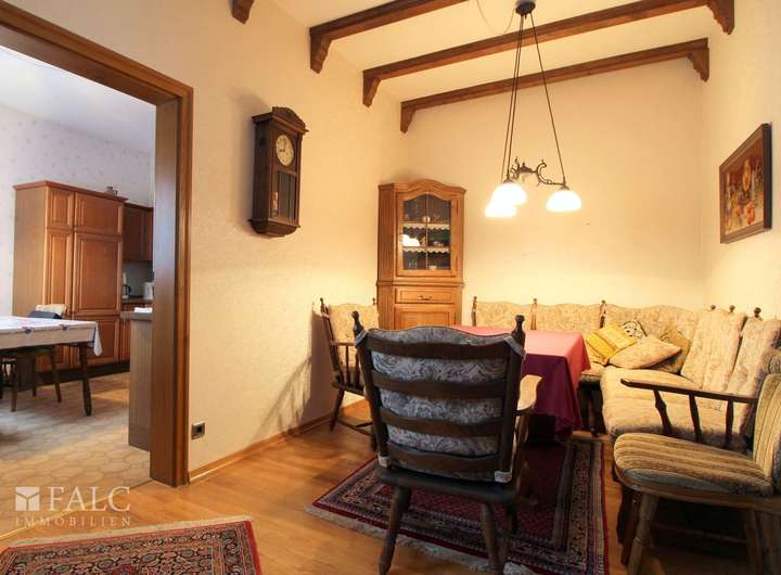 Die Wohnung im ersten und zweiten Obergeschoss des Vorderhauses ist mit einem nicht vererbbarem Nießbrauchrecht für die aktuelle Bewohnerin im Grundbuch gesichert. Diese Wohnung hat ca. 132 m² Wohnfläche mit einem großzügigen Wohn-Esszimmer mit Zugang zur Dachterrasse, einer Küche und einem Gäste-WC im ersten Geschoss sowie drei Schlafzimmern und einem Badezimmer im zweiten Geschoss.