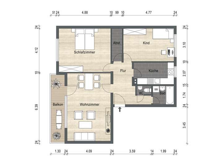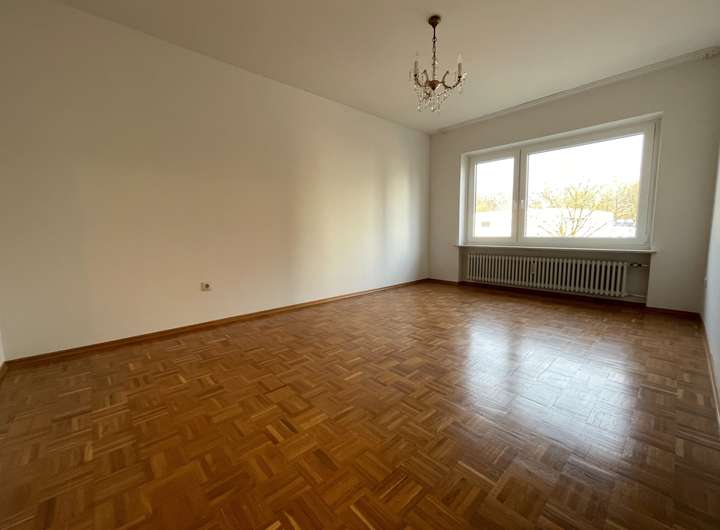 Das Wohnzimmer wurde mit schönen Echtholzparkett ausgestattet. Der Balkon ist sehr großzügig und mit Blick auf den großen Gemeinschaftsgarten. Zum Sonnenschutz ist am Balkon eine Markise angebracht.