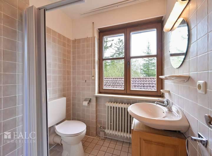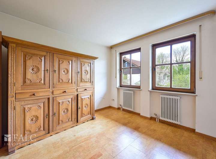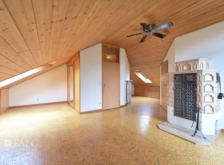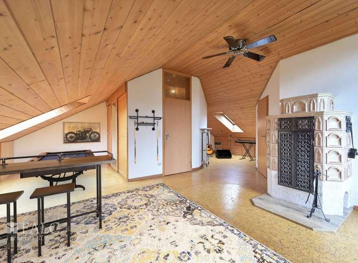 Im ersten Obergeschoss befindet sich ein großzügiges Schlafzimmer mit eigenem Badezimmer, sowie zwei weitere Zimmer mit direktem Blick auf den Garten und ein zusätzliches Badezimmer. Eine Etage höher erwartet Sie ein gemütliches Dachgeschosszimmer ausgestattet mit einem weiteren Badezimmer, einem charmanten Kachelofen, der eine warme Atmosphäre schafft, sowie Zugang zu einem kleinen Balkon.