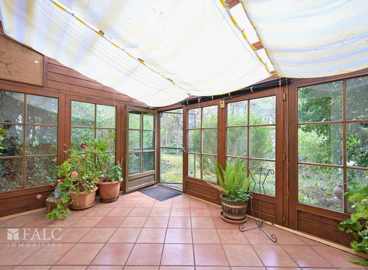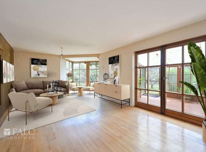 Der helle Wohnbereich überzeugt mit weitläufigen Glasfronten, die ein offenes Ambiente schaffen und den Blick in den liebevoll angelegten Garten freigeben. Direkt angrenzend lädt der lichtdurchflutete Wintergarten zum Verweilen und Entspannen ein.