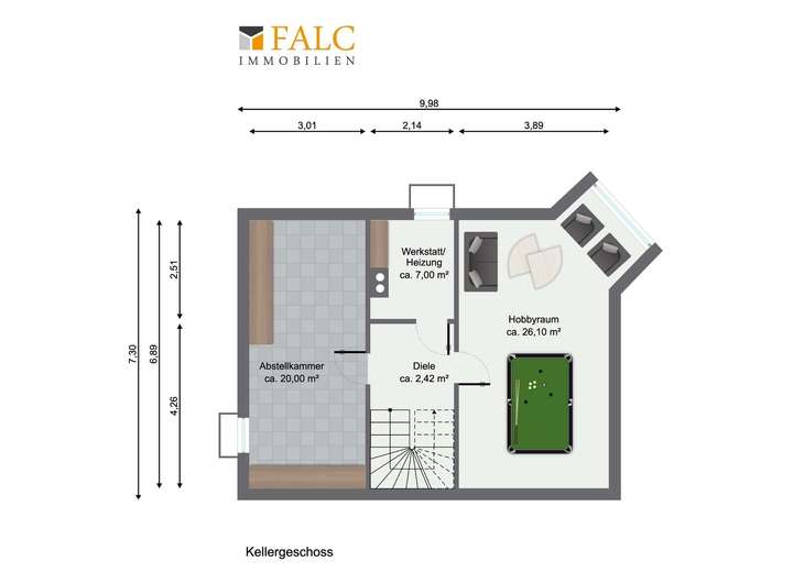 Im Untergeschoss überrascht der Keller mit viel Stauraum sowie einem zusätzlichen hellen Raum, der dank eines großen Fensters mit Blick in den Garten vielseitig nutzbar ist – sei es als Hobbyraum, Arbeitsbereich oder zusätzlicher Wohnraum.