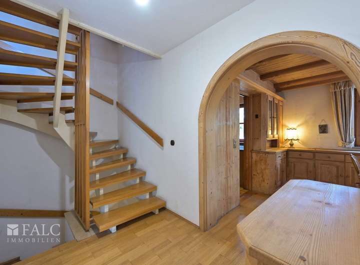 Ein überdachter Eingangsbereich verbindet auf praktische Weise die Garage, den Garten sowie den Hauseingang. Die geräumige Diele schafft eine einladende Atmosphäre und bietet ausreichend Platz für eine Garderobe sowie den Zugang zu einem Gäste-WC. Zur Rechten befindet sich die Küche mit angrenzendem Essbereich mit Kachelofen. Durch die durchdachte Aufteilung und die vom Schreiner maßgefertigte Holz-Sitzecke entsteht eine gemütliche Wohnküche.