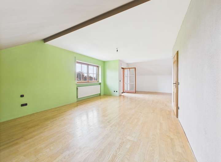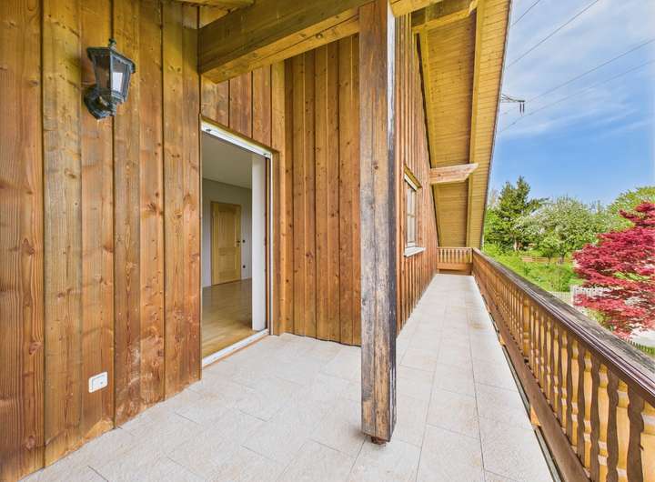 Das Elternschlafzimmer bietet die Möglichkeit zur Abtrennung eines weiteren Raums – ideal für ein Büro, Ankleidezimmer oder ein zusätzliches Kinderzimmer. Die 2-fach verglasten Holzfenster, der große Garten und der unverbaubare Fernblick mit Alpensicht bei klarem Wetter runden dieses Angebot ab.