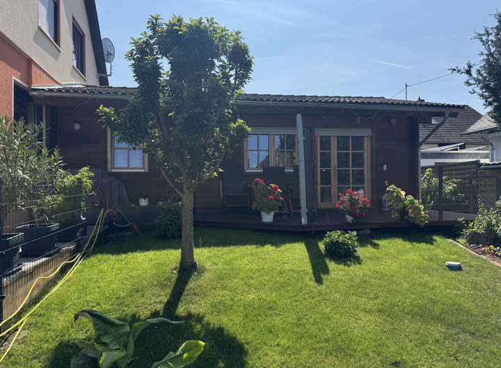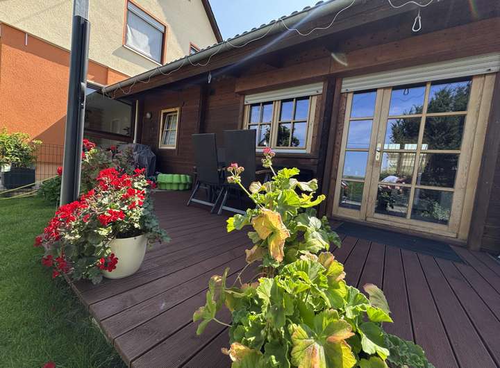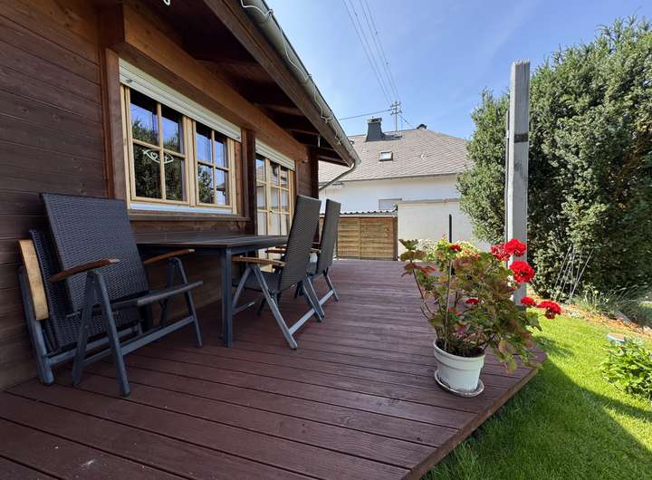 Die separate Einliegerwohnung (Baujahr 2001) im Blockhüttenstil eignet sich perfekt als Ferienwohnung oder für Gäste. Sie umfasst einen Wohnraum mit Küche, ein Schlafzimmer und ein modernes Duschbad.