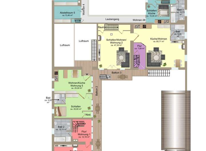 - Wohnung Nr. 5: ca. 50 m², im Obergeschoss, 2 Zimmer, 1 Bad, Balkon, separater Zugang