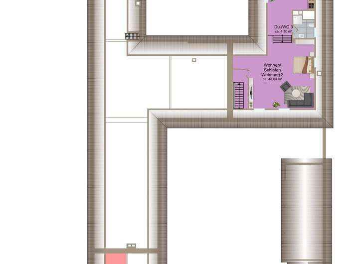 - Wohnung Nr. 3: ca. 90 m² im Dachgeschoss, 2 Zimmer, 1 Bad, kleiner Freisitz, separater Zugang