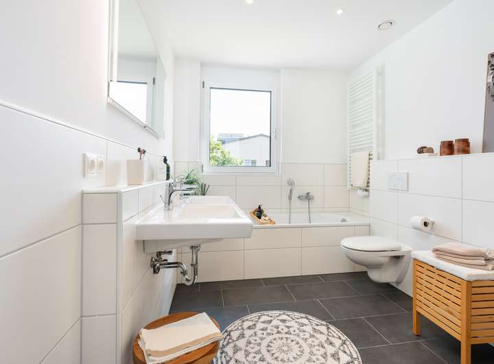 • Die bodengleiche geflieste Dusche mit Echtglastrennwänden und Spiegel in allen Bädern sowie eine moderne Sanitärausstattung und einem Doppelwaschtisch im Hauptbad bieten höchsten Komfort und Funktionalität.