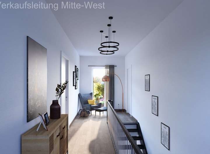 Konkret bedeutet das: vom großen Wohn-Ess-Koch-Bereich ist der direkte Zugang auf die Terrasse und damit ins Grüne möglich. Büro, Hauswirtschaftsraum sowie Gäste-WC sind unterdessen gegenüberliegend und unmittelbar aus der Diele zugänglich. Im Obergeschoss befinden sich neben dem Reich der Eltern zwei identisch große Kinderzimmer sowie ein geräumiges Bad mit Wanne, Dusche und WC.