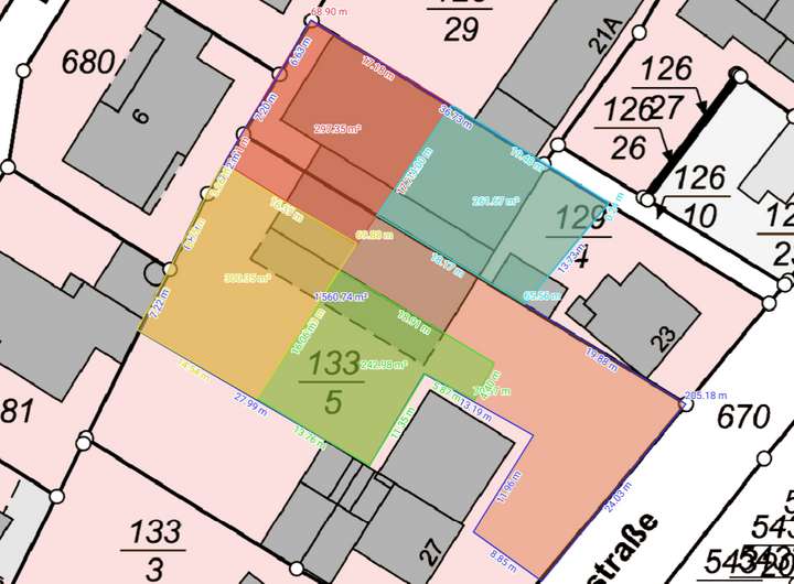 Das indikative Teilungskonzept sieht eine Aufteilung der gesamten verkauften Flächen in Baugrundstücke mit Größen zwischen 260 und 320m² vor, denen mitverkaufte Erschließungsflächen von je ca. 90m² zugeordnet sind. Dabei ist sowohl der Erwerb einzelner als auch mehrerer zusammenhängender Parzellen möglich.