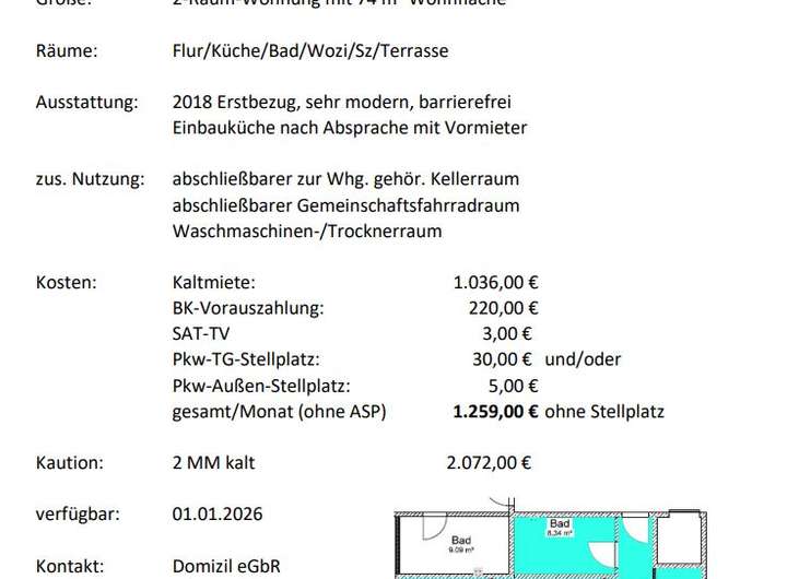 | Gesamtmiete | 1.259 € (zzgl. Heizkosten) |