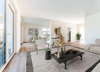 Im hinteren Bereich dieser Etage befindet sich das geräumige und loungeartig gestaltete Wohnbereich mit lichtdurchfluteten ebenerdigen Fenstern. Durch die großen Fensteröffnungen im Wohn- und Essbereich haben Sie einen direkten Zugang zur Terrasse. Die offen gehaltene Wohnküche wurde zweckmäßig in das Wohnzimmer integriert. Die Fußbodenheizung in allen Wohnräumen sowie in den einzelnen Bädern sorgt für eine gemütliche Atmosphäre [...]