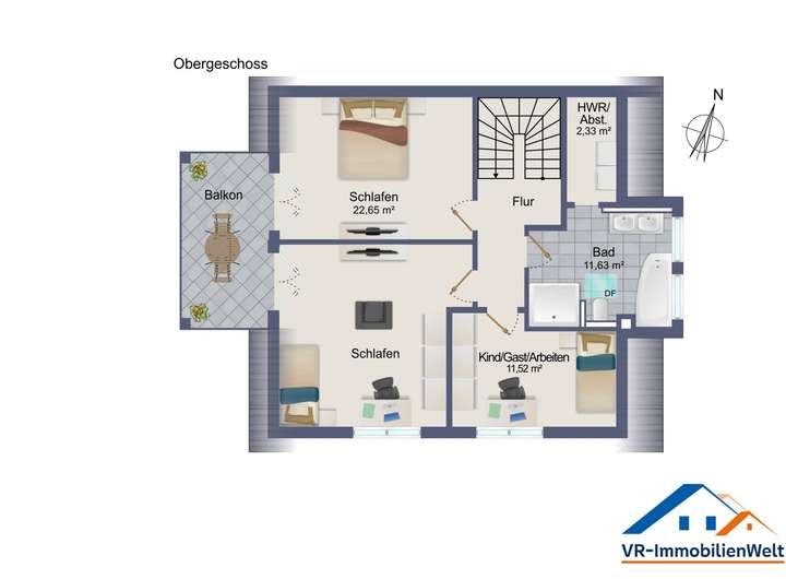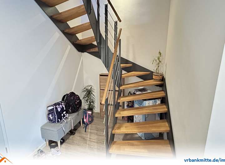 Über eine massive Eichentreppe gelangt man in das Obergeschoss. Hier befinden sich 3 Zimmer, ein Abstellraum, ein großzügiges hochwertig gestaltetes Badezimmer mit Dusche und Badewanne. Zwei Zimmer haben direkten Zugang zu dem großen Balkon. Zwei charmante Gauben bieten zusätzliche Wohnqualität und Raumvielfalt. Die Wohnfläche im Obergeschoss beträgt ca. 72.89 m².