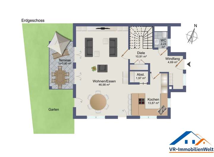 Durch den modern gestalteten Hauseingangsbereich gelangt man in das großzügige Wohn- und Esszimmer und offener Küche mit direktem Zugang zu der Terrasse. Weiterhin befindet sich im Erdgeschoss ein Gäste-WC und eine Speisekammer. Die Wohnfläche beträgt im EG ca. 80,65 m² .