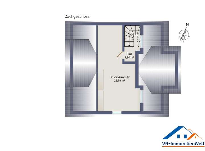 Im Dachgeschoss befindet sich ein großes Studiozimmer, was vielfältig genutzt werden kann. Es hat eine Wohnfläche von ca. 27,59 m².