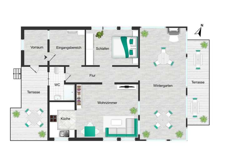 Vorbei an der nach Südwesten ausgerichteten Terrasse gelangt man über den Eingangsbereich in einen einladenden Flur, von dem aus sämtliche Räume erschlossen sind.