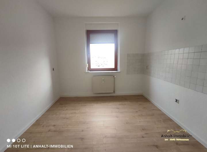Die Küche ist ebenfalls mit Laminat ausgestattet und verfügt über einen robusten Fliesenspiegel. Außerdem sind praktische Anschlüsse für eine Spülmaschine und einen E-Herd vorhanden, und das Küchenfenster sorgt für eine angenehme Belüftung und viel Tageslicht.