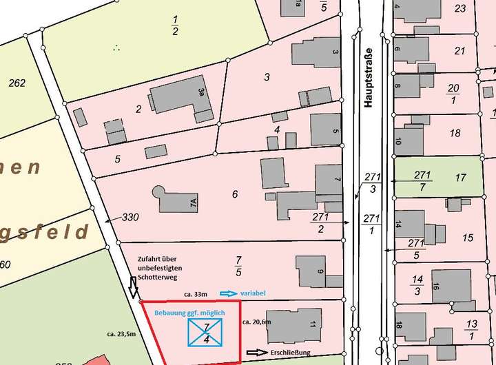 Die Erschließung müsste über die Hauptstraße erfolgen und könnte mittels Dienstbarkeiten grundbuchrechtlich gesichert werden. Die Kosten hierfür wären vom Käufer zu tragen.