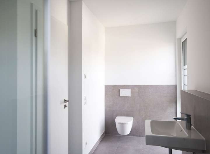 • 1 attraktives, hellgrau gefliestes Bad (Fliesen 120 x 60 m²) mit