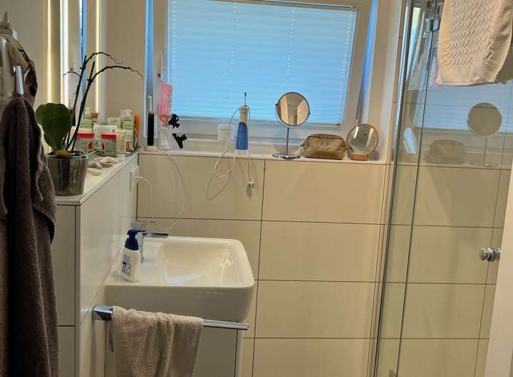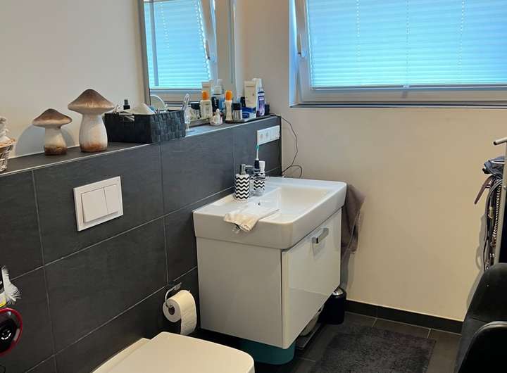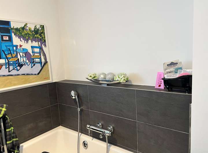 Die Wohnung beeindruckt mit modernen Ausstattungsdetails: Die Bäder sind mit dunklen Fliesen sowie edlen Sanitärobjekten von Villeroy & Boch ausgestattet. Ergänzt wird das hochwertige Erscheinungsbild durch stilvolle Grohe-Armaturen, inklusive Regendusche und separater Handbrause.