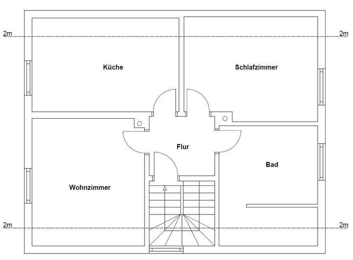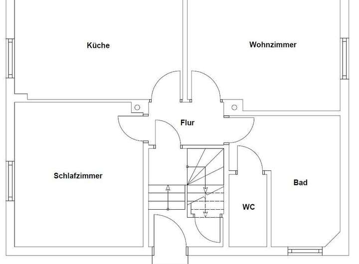 Die beiden Wohnungen (EG und OG) haben einen identischen, praktischen Grundriss: Vom Flur aus erreichen Sie links das Schlafzimmer, geradeaus links die Küche, geradeaus rechts das Wohnzimmer sowie rechts das Badezimmer mit Abstellraum/Nische.