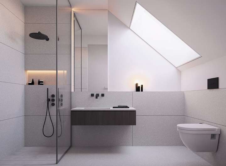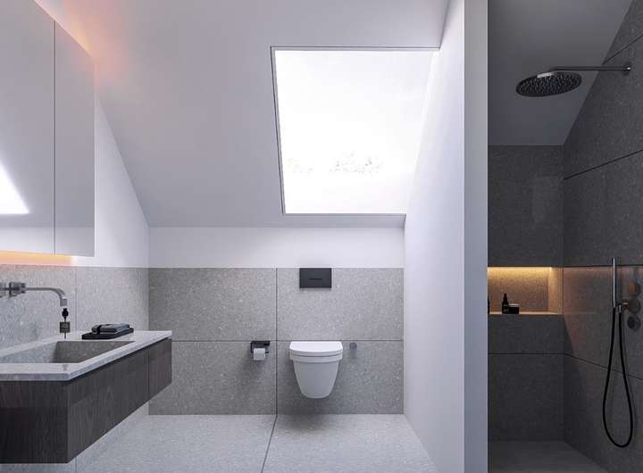 + moderne Feinsteinzeugfliesen mit Edelstahl-Abschlussleisten in den Bädern