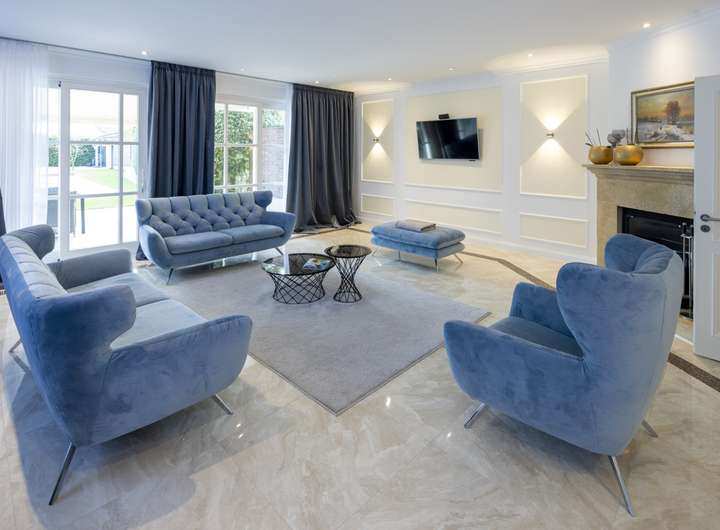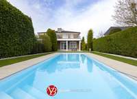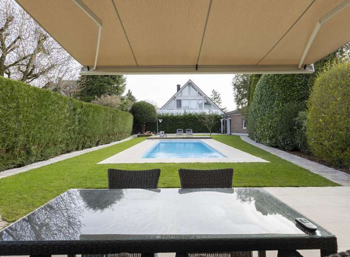 Von dem geräumigen Eingangsbereich mit einer Empore über dem Treppenhaus gleitet ihr Blick bis in den Garten. Das zum Garten ausgerichtete Wohnzimmer verfügt über einen Kamin und wird an warmen Tagen durch zwei Schiebefensteranlagen zur Terrasse erweitert. Die überdachte Terrasse wird dann mit zwei elektrischen Markisen ganz sicher zu Ihrem Lieblingsplatz. Der neu angelegte Garten ist beleuchtet und verfügt über einen mit einer Wärmepumpe beheizten Außenpool.