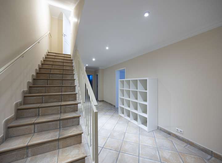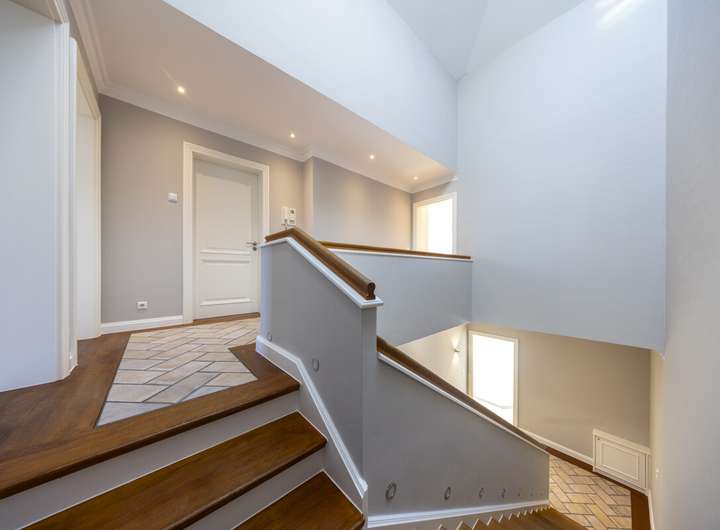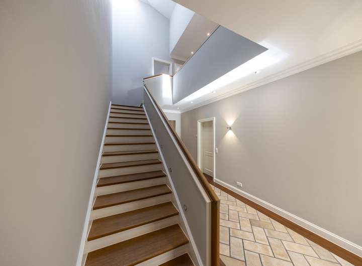 - Treppenhaus mit Empore und beleuchteten Treppenstufen