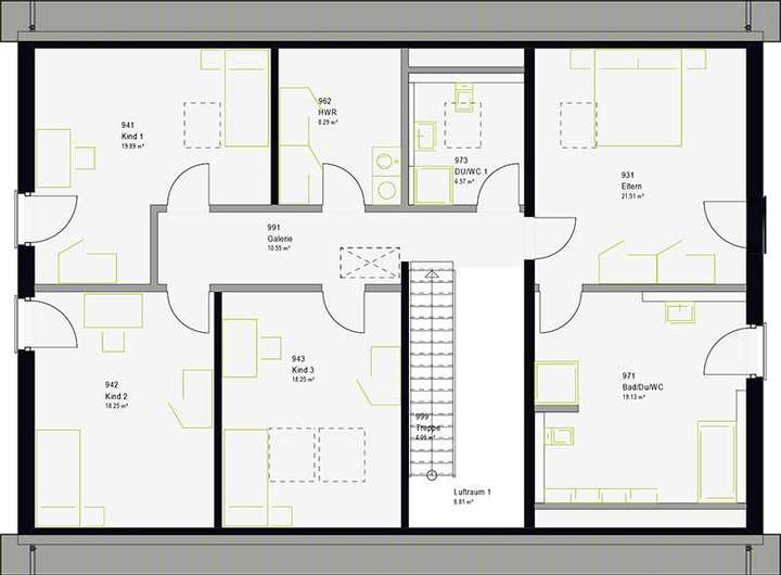 Das FamilyStyle 26.01 S bietet auf einer Nettogrundfläche von 265 m² viel Raum für unterschiedlichste Wohnideen - vom Mehrgenerationenwohnen bis zur vermieteten Einliegerwohnung als Finanzierungshilfe. Möglich macht dies die Aufteilung des Hauses in eine komplette, separate Wohnung im Erdgeschoss - und das eineinhalbgeschossige Wohnen der Bauherrenfamilie, das das Erdgeschoss ausschließlich dem Lebensmittelpunkt im offen angelegten Wohn-, Ess- und Küchenbereich vorbehält. Im Obergeschoss gestatten 127 m² großzügiges Wohnen in drei Kinderzimmern samt eigenem Kinderbad sowie im Elternzimmer mit direkt angegliederter Wellness-Oase.