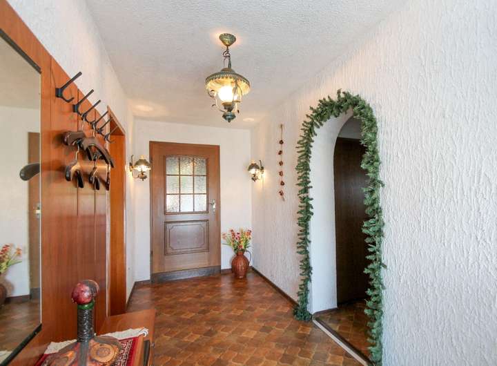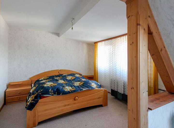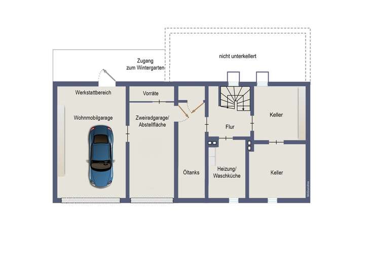 Im Obergeschoss erwarten Sie drei geräumige Zimmer, die sich ideal als Schlaf-, Kinder- oder Gästezimmer nutzen lassen. Der Keller bietet neben einer Waschküche und einem Heizungsraum auch einen separaten Abstellraum sowie einen weiteren Abstell- oder Hobbyraum. Darüber hinaus haben Sie über den Keller direkten Zugang zu den beiden Garagen, die praktischen Stauraum für Fahrzeuge oder Werkstattbedarf bieten. Die hintere Garage ist mit einem großen Rolltor ausgestattet und bietet dank ihrer Höhe auch ausreichend Platz für die Unterbringung eines Wohnmobils. Über eine Treppe innerhalb dieser großen Garage gelangen Sie direkt zum Wintergarten hinter dem Haus – ein praktischer Zugang mit direkter Verbindung zum Gartenbereich.