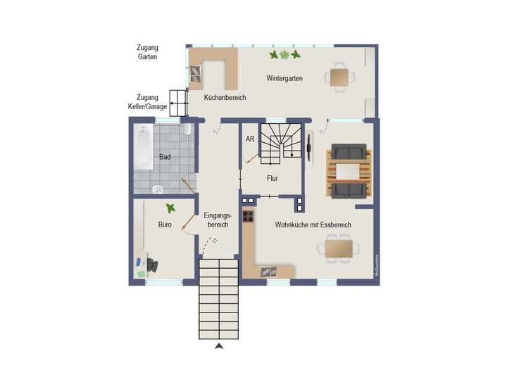 Über einen Treppenaufgang gelangen Sie ins Erdgeschoss. Direkt nach dem Hauseingang befindet sich ein vielseitig nutzbares Zimmer, das sich ideal als Büro oder Gästezimmer eignet. Ebenfalls auf dieser Ebene finden Sie ein großzügiges Badezimmer mit Badewanne sowie einen praktischen Abstellraum. Der Flur führt weiter zur Treppe, die sowohl ins Obergeschoss als auch in den Keller führt. Von hier aus erreichen Sie auch die offene Küche, die direkt in den Essbereich übergeht und an den angrenzenden Wohnbereich anschließt. Ein besonderes Highlight ist der helle, großzügige Wintergarten, der zusätzlichen Wohnraum bietet und über eine separate Küche sowie einen weiteren Essbereich verfügt. Vom Wintergarten aus haben Sie direkten Zugang zum Garten hinter dem Haus, dessen Begrünung einen hervorragenden Sichtschutz bietet.
