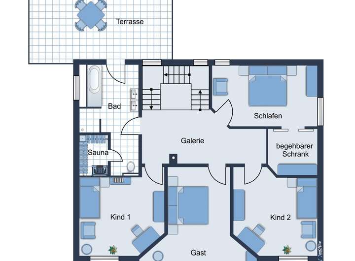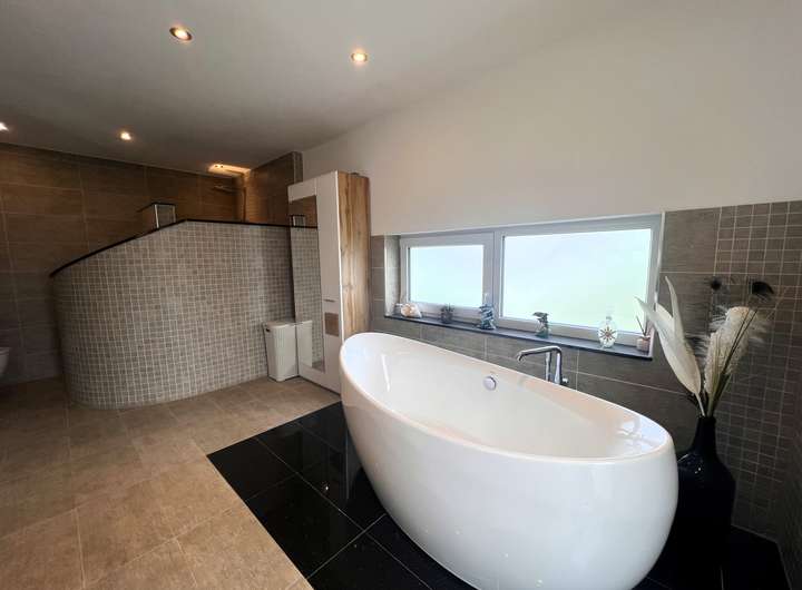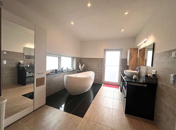 Das Raumangebot umfasst fünf flexibel nutzbare Schlafzimmer, wovon sich eines auch hervorragend als Arbeitszimmer eignet. Ein separates Ankleidezimmer schafft zusätzlichen Komfort im Alltag. Das Badezimmer ist luxuriös gestaltet und bietet eine hochwertige Sanitärausstattung. Die Nutzung des Hauses gestaltet sich zudem durch den durchdachten Grundriss und die hochwertige Haustechnik sehr komfortabel und energetisch.