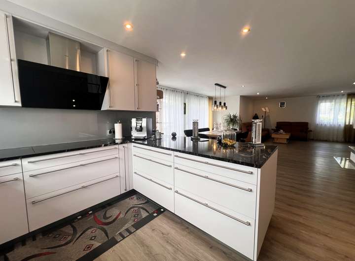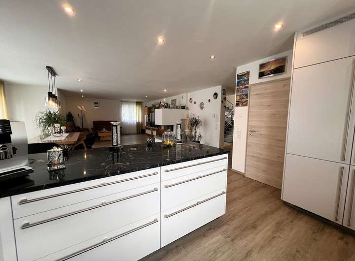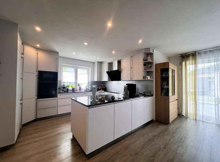 Die angrenzende Küche überzeugt mit einer modernen Einbauküche, Kochinsel und Arbeitsflächen aus Naturstein. Angrenzend finden Sie eine praktische Speisekammer. Damit stehen Ihnen optimale Voraussetzungen für geselliges Kochen und gemeinsames Essen zur Verfügung.