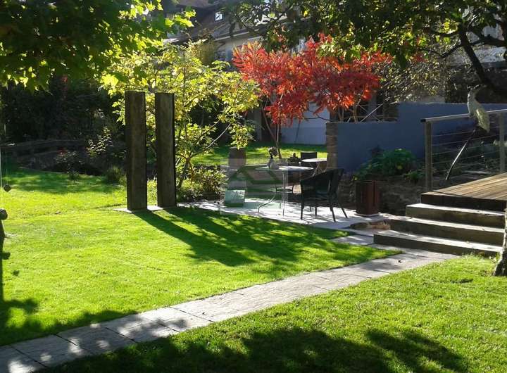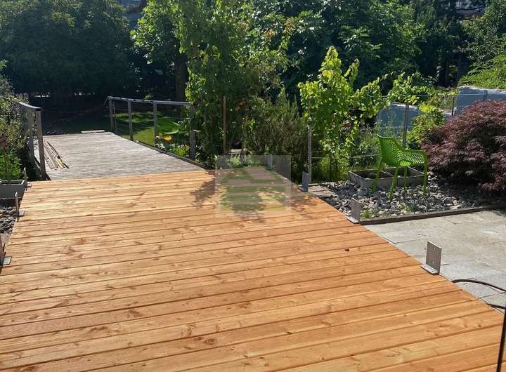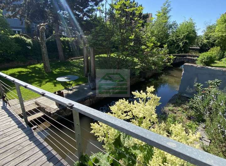 Die großzügige Terrasse und der Garten laden zum Entspannen ein und verfügen über eine eigene Brücke, die über den angrenzenden Bach führt. Trotz der zentralen Lage strahlt der Garten sehr viel Ruhe zum Entspannen aus.