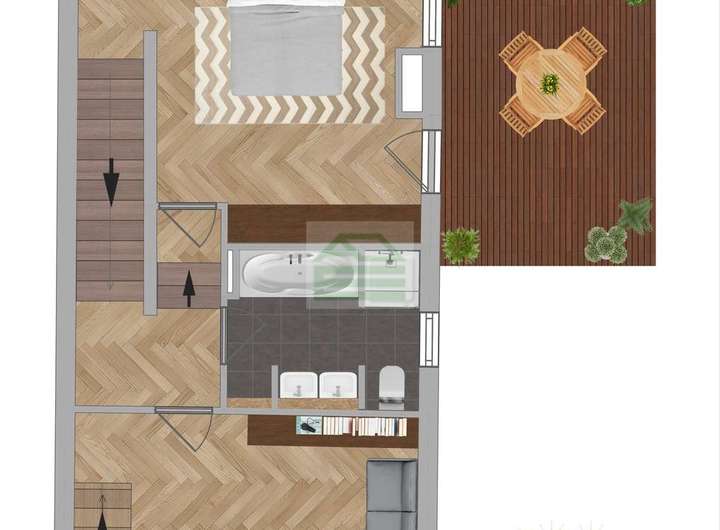 Ein Highlight im Obergeschoss ist die große Terrasse und Loggia direkt angrenzend zum Schlafzimmer und Arbeitszimmer.