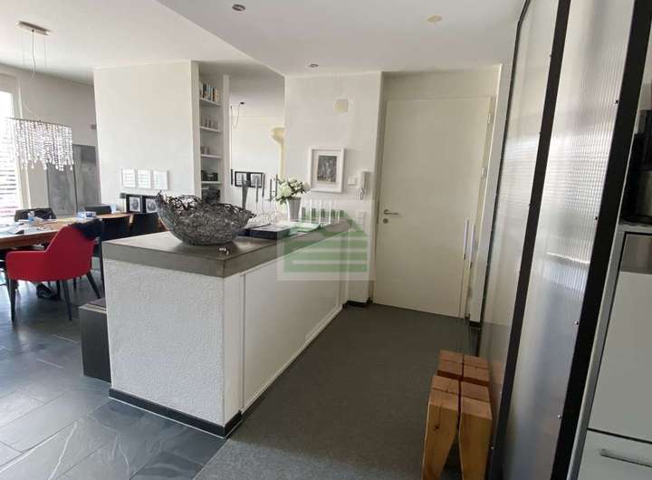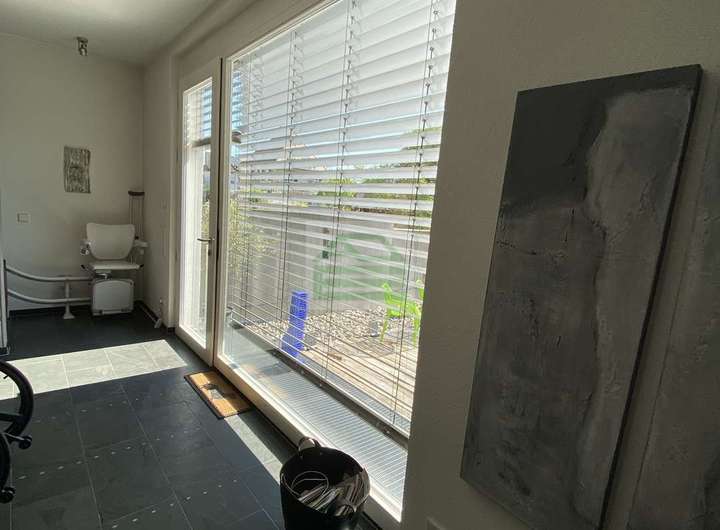 Direkt beim Betreten des Hauses von der Straßenseite aus, laufen Sie durch den unscheinbaren Eingang in einen Vorhof mit großen Glasfenstern zum Wohnzimmer hin. Im Hauseingang findet sich neben der Garderobe ein Gäste-WC und führt zur linken Seite direkt in die große, hochwertige Küche, welche extra angefertigt wurde. Ein Highlight hier ist der Boden, welcher aus einzigartigem Natursteinschiefer besteht.