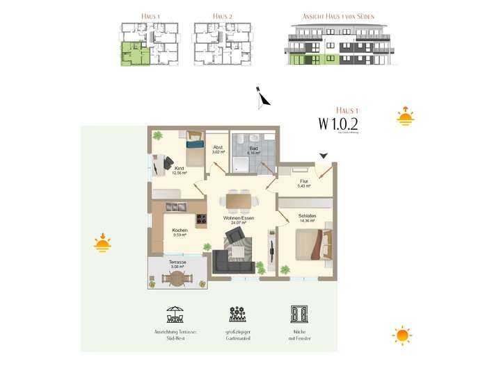 Die Wohnung W 1.0.2 ist eine 3-Zimmer-Wohnung mit ca. 78,30 m² Wohnfläche im Erdgeschoss. Zur Wohnung gehört eine Terrasse mit ca. 6,16 m² (Nutzfläche) mit vorgelagertem Gartenanteil von ca. 122 m² und ein Tiefgaragen-Stellplatz. Die Terrasse ist nach Süd-West ausgerichtet.