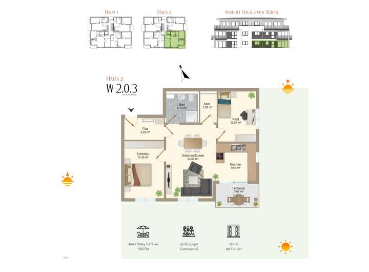 Die Wohnung W 2.0.3 ist eine 3-Zimmer-Wohnung mit ca. 78,30 m² Wohnfläche im Erdgeschoss. Zur Wohnung gehört eine Terrasse mit ca. 6,16 m² (Nutzfläche) mit vorgelagertem Gartenanteil von ca.157 m² und ein Tiefgaragen-Stellplatz. Die Terrasse ist nach Süd-Ost ausgerichtet. Die Ausführung ist barrierefrei!