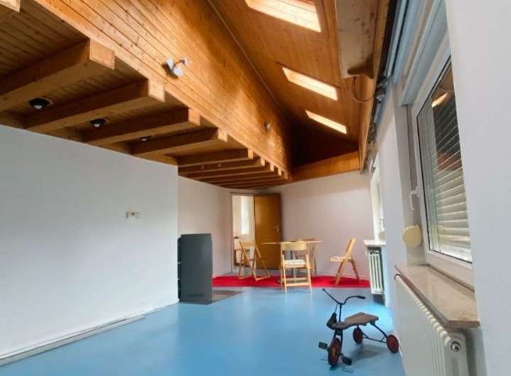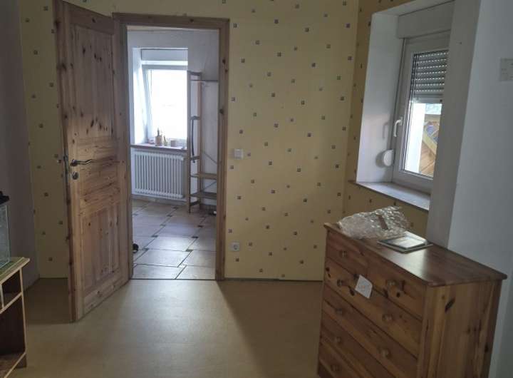 Das Obergeschoss verfügt über zwei Zimmer, eine Küche und ein Badezimmer mit Badewanne, Dusche und Fenster. Ein besonderes Highlight ist der großzügige Wohnbereich sichtbaren Holzbalkendecken und Zugang zu einem kleinen Balkon, der gemütliche Stunden im Freien verspricht.