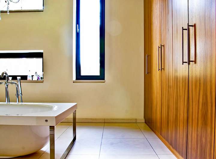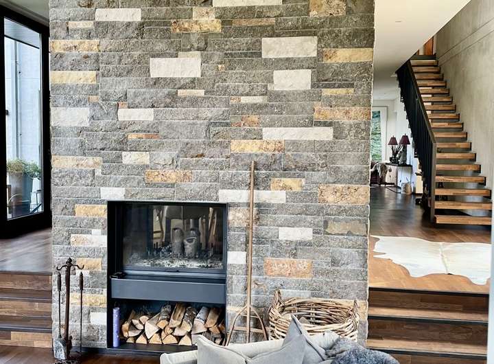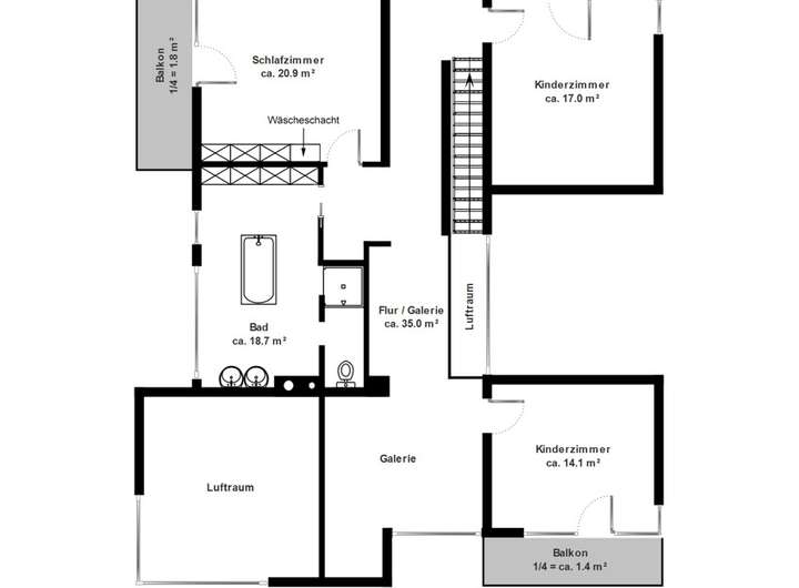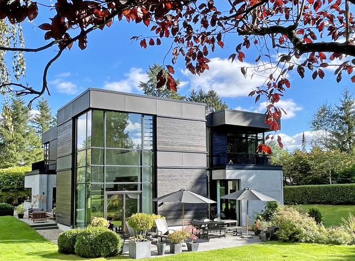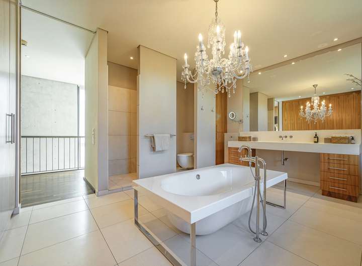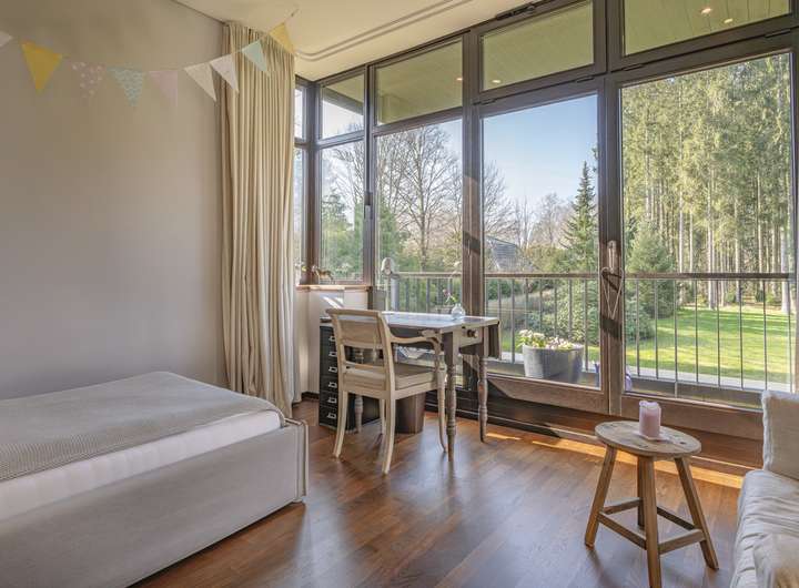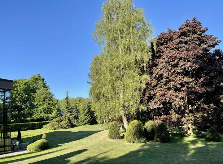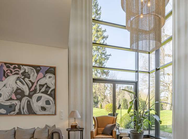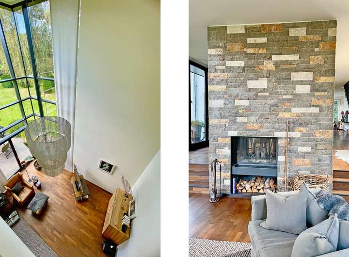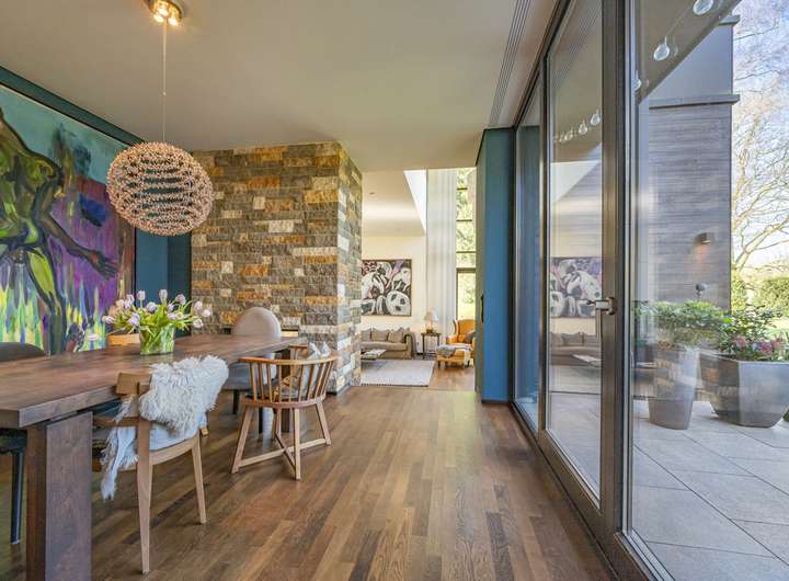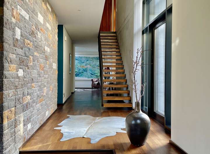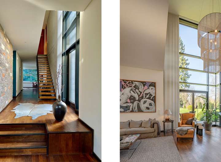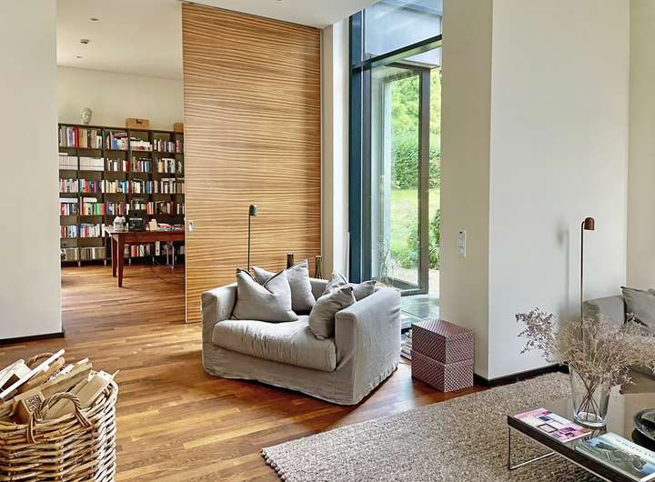 Holz und Naturstein bilden einen warmen Kontrast zur Betonwand der Treppenanlage und dokumentieren den individuellen Charakter des Hauses. Im Erdgeschoss bereichert ein Parkett aus geräucherter Eiche das Raumgefüge und darauf abgestimmt wurden geschosshohe Türen aus Zebranoholz verbaut. Im gesamten Haus wurden Einbauschränke maßangefertigt und unterstreichen den warmen Charakter im Inneren der Immobilie. Großzügigkeit entsteht durch räumliche Offenheit. In dem architektonisch außergewöhnlich gestalteten Wohnbereich mit einer Deckenhöhe und Fensterfläche von fast sieben Metern scheint das Wohnen mit der Natur zu verschmelzen. Ein Durchsichtkamin aus Naturstein bildet den Mittelpunkt des Split-Level Bereiches zwischen dem Wohn- und Essbereich.Im Obergeschoss genießen die Eltern das Schlafzimmer und ein Vollbad mit einer freistehenden Badewanne als privaten Rückzugsort zum Relaxen. Die beiden weiteren Zimmer verfügen über eine Terrasse oder einen Balkon mit einem traumhaften Blick auf das parkähnliche Grundstück.