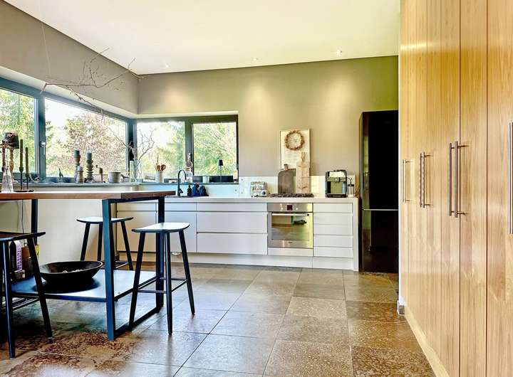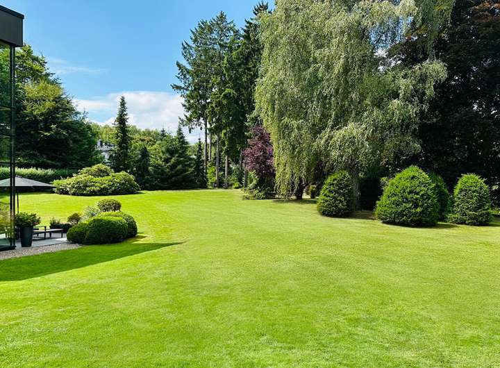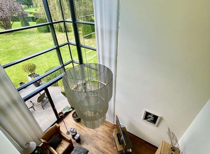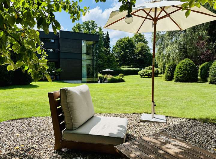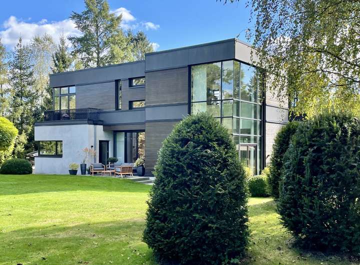 Diese einzigartige und lichtdurchflutete Immobilie wirkt wie hineingewachsen in die wunderschöne Natur, die sie umgibt. Es entsteht der Eindruck einer grenzenlosen Architektur, die das Wohnen auf dem parkähnlichem Grundstück mit altem Baumbestand zu einem emotionalen Erlebnis werden lässt. Klare Formen und eine warme Materialsprache aus Holz, Naturstein und Sichtbeton bilden ein Statement zu zeitlosem Wohnen. Im Inneren erzeugen die harmonisch ineinander fließenden Räume - mit einer spektakulären Lichtfülle und fast sieben Meter hohen Decken im Eingangs- und Wohnbereich - ein großzügiges, aber lässiges Wohngefühl. So zeitgemäß wie zeitlos erscheint diese moderne Immobilie aus dem Baujahr 2004 und bietet Ihnen mit ca. 292 m² Wohnfläche - verteilt auf sechs Zimmer, drei Bäder, einen großzügigen Küchen- und Essbereich, zwei Vorratsräume und einen Teilkeller ein modernes Refugium auf einem Grundstück von ca. 6.882 m². Haben wir Ihre Sinne neugierig gemacht? Dieses Objekt passt zu Menschen, die eine Immobilie mit einem einzigartigem Charakter, Stil und Persönlichkeit suchen. Es besteht die Möglichkeit einer weiteren Bebauung beispielsweise für die Familie unterstützende Eltern oder Schwiegereltern.