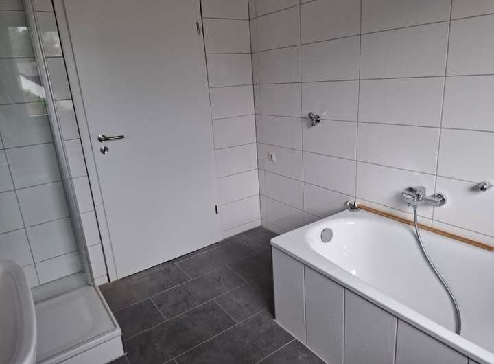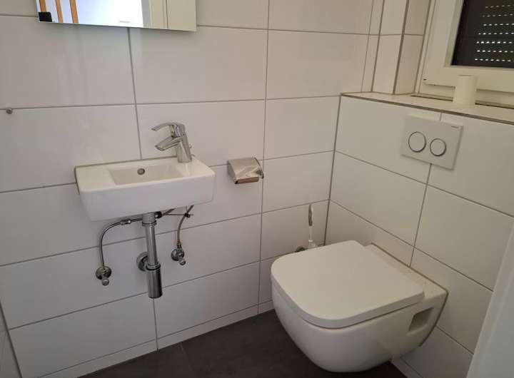 Im Erdgeschoss stehen zwei Zimmer, das Wohnzimmer mit Zugang zur Terrasse, ein Bad, das Gäste-WC und die Küche mit geräumigem Essplatz zur Verfügung. Im Dachgeschoss gibt es vier weitere Zimmer, den Hauswirtschaftsraum und das zweite Bad. Beide Bäder wurden vor wenigen Jahrene komplett erneuert und verfügen über Wanne, Dusche, Waschtisch und WC.